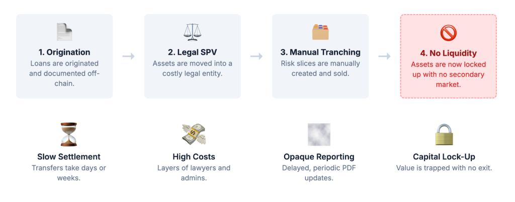 At its core, securitisation is the process of taking illiquid assets—like a bundle of small business loans, packaging them together, and selling slices of that package to investors. Each slice, or “tranche,” carries a different level of risk and potential return. This allows lenders to get loans off their books to free up capital, and it gives investors access to different types of credit assets. While powerful in theory, the traditional way of doing this is incredibly inefficient.