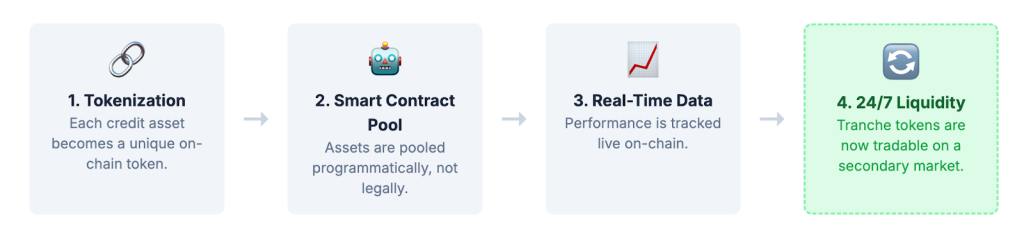 - On-Chain Pooling: Instead of a complex legal SPV, a smart contract acts as a transparent, automated vehicle. It programmatically bundles the loan tokens into a digital pool, with all its rules and cash flows auditable on-chain.